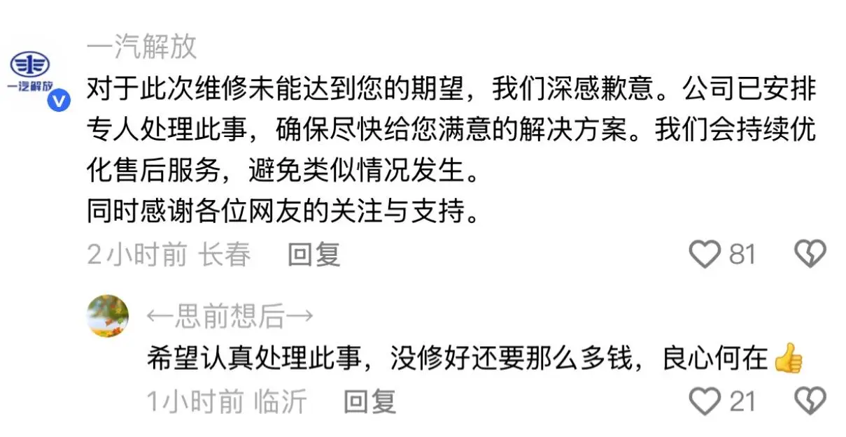 随后车企也得知了这件事,称一定会派专人处理这件事,网友们都在等一个说法。